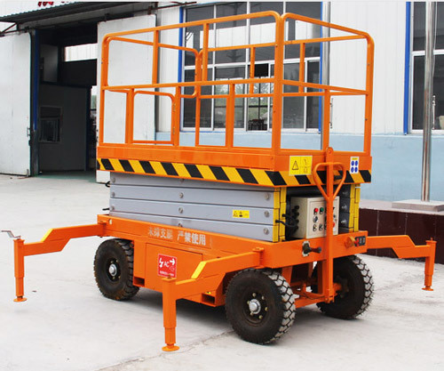 移动式液压升降机主结构采用高强度矩形管制作,强度高,坚固耐用;设有升降台超载液压安全保护系统;有底座、臂架和工作台三部分组成。底座采用槽钢焊接而成;臂架为剪叉交链式垂直升降;设有防止管路爆裂的防坠安全保护系统;设有停电时应急下降的手控下降阀;采用精磨的液压油缸体,进口密封件,保障油缸良好的密封性能;移动式液压升降机防护栏高度在900MM-1200MM之间,客户可根据要求选择护栏高度;加配上手动液压装置,可在停电或无电源场所照常升降工作;并可加伸缩平台,在平台长度不足时可延伸至所需位置,从而提高工作效率;可根据使用场地选择实心轮胎和充气轮胎。